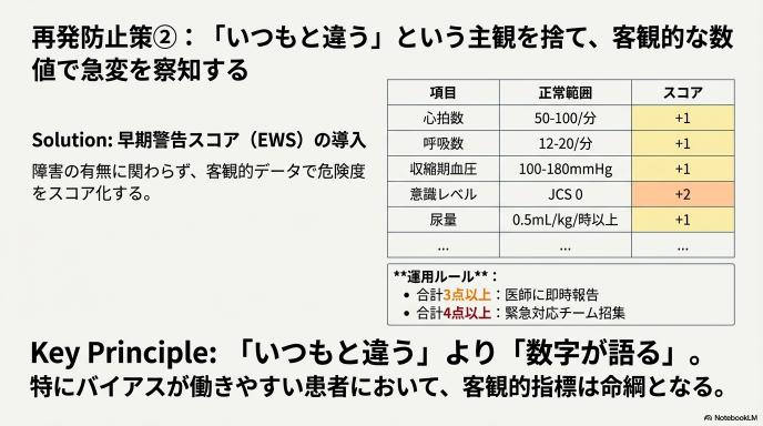 悪意はありません。しかし結果として、適切な治療の開始が遅れました。もしこの時点で、客観的な早期警告スコアがあったら。もし採血データという数字があったら。主観的な「落ち着いている」という判断に頼らず、適切な治療が開始できたはずです。