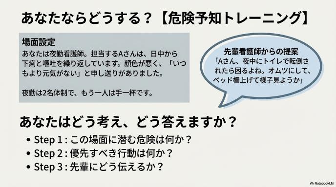 先輩看護師から提案がありました:「Aさん、トイレに頻繁に行くし、夜中に転倒されたら困るよね。オムツにして、ベッド柵上げて様子見ようか」