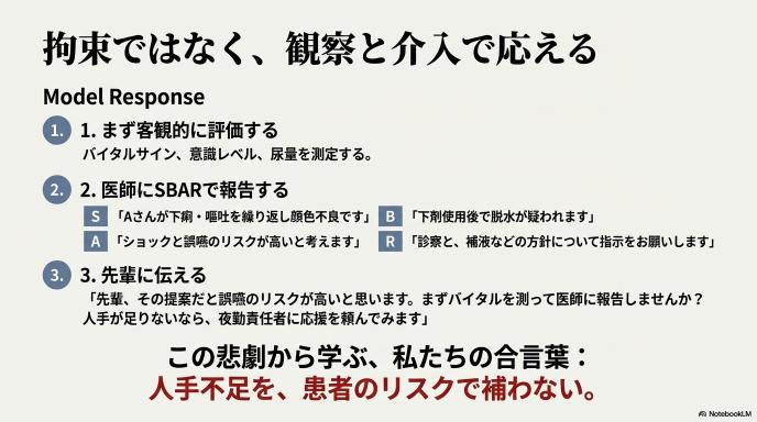 「先輩、その提案だと誤嚥のリスクが高いと思います。Aさんは嘔吐を繰り返しているので、仰向けで拘束すると吐物が気管に入る危険があります。まず、バイタルと尿量を測定して医師に報告し、指示をもらいませんか? 人手が足りないなら、夜勤責任者に応援を頼むか、ご家族に付き添いをお願いできないか確認してみます」