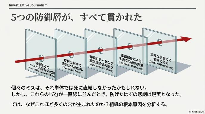 もしこの時点で、適応外処方に対する承認制度があったら。もし電子カルテが「用量超過」で強制的にアラートを出すシステムだったら。もし薬剤師が「おかしい」と声を上げていたら。最初の穴は、ここで塞げたはずでした。