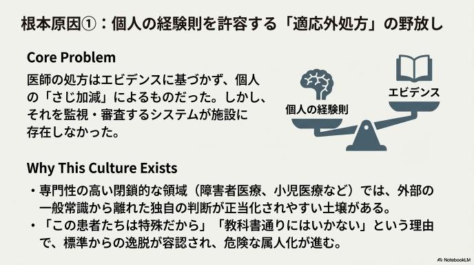医師の処方は、エビデンスに基づかない個人の裁量によるものでした。しかし施設には、こうした適応外使用を監視・審査するシステムが存在しませんでした。医師の「さじ加減」が許容される文化があったのです。