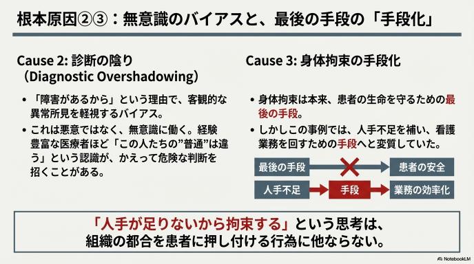 身体拘束は本来、患者の生命を守るための最後の手段です。しかしこのケースでは、看護業務を回すための手段へと変質していました。