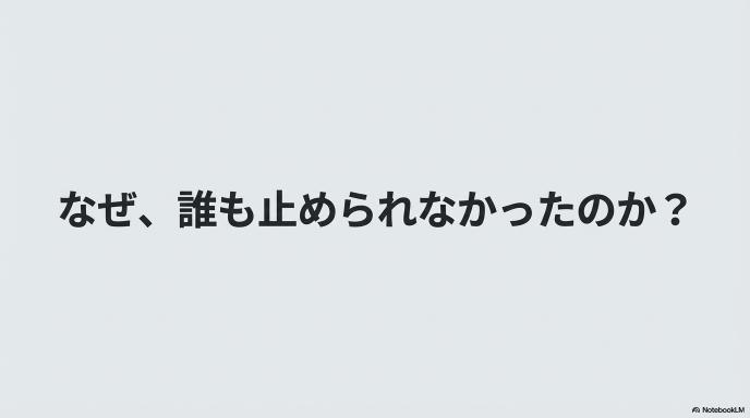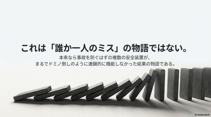 重要なのは、この事故が「誰か一人のミス」では説明できないという点です。むしろ、本来なら事故を防ぐはずの複数の安全装置が、まるでドミノ倒しのように連鎖的に機能しなかった結果なのです。