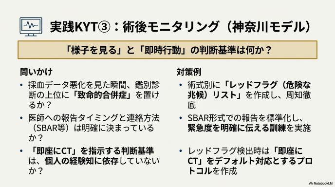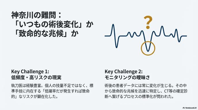 2. 神奈川の教訓: 低頻度だが致死的な合併症に対し、術後モニタリングとエスカレーション(上位医師への報告・対応依頼)をどれだけ鋭敏にできるかが生死を分ける