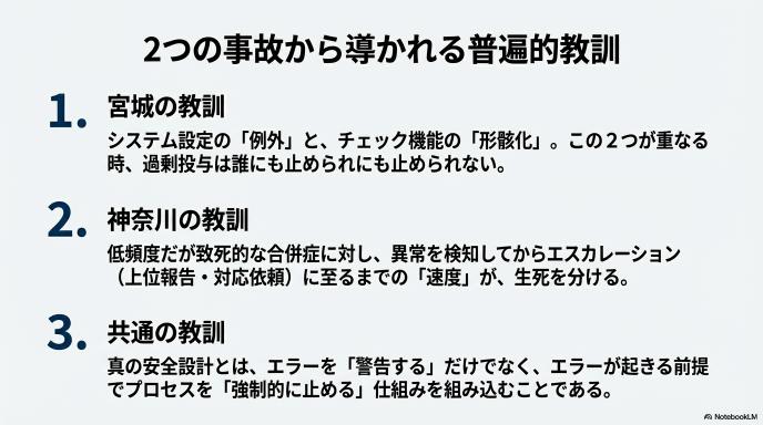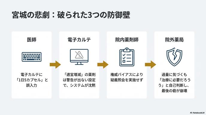 1. 宮城の教訓: システム設定の「例外」と疑義照会の形骸化が重なると、過剰投与は誰も止められない