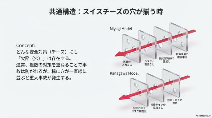 医療安全の世界では、「スイスチーズモデル」という考え方があります。チーズの穴のように、どんな安全対策にも「欠陥(穴)」が存在します。しかし通常、複数の対策(チーズのスライス)を重ねることで、穴が一直線に並ぶことはなく、事故は防がれます。