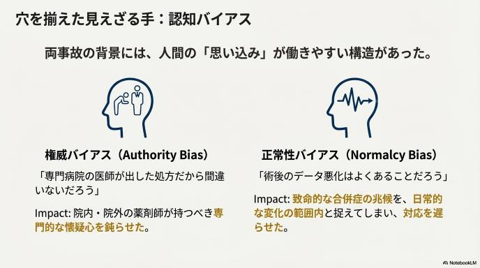 両事故に共通するのは、人間の認知バイアス(思い込み)が働きやすい構造があったことです。