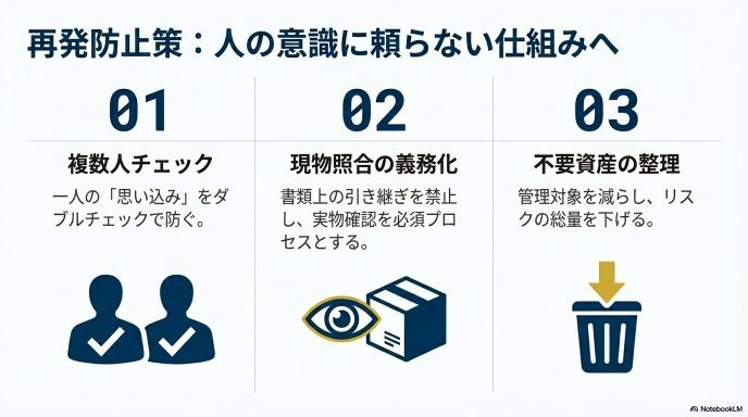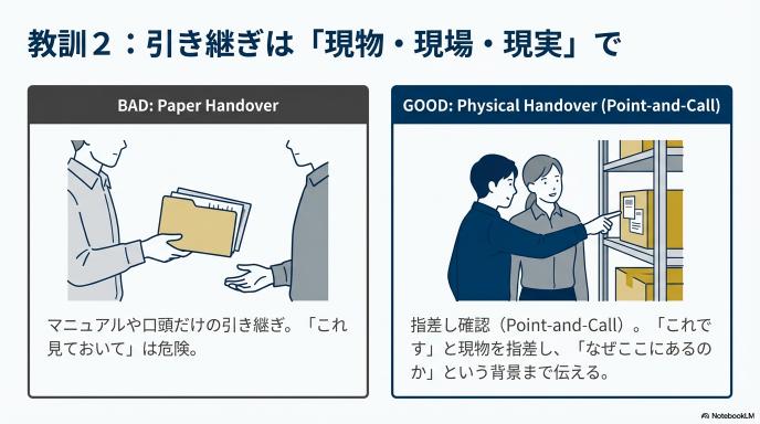 マニュアルや口頭だけの引き継ぎは危険です。「これです」と指差し確認すること、そして「なぜこれがあるのか」という背景まで伝えることが、思い込みを防ぐ唯一の手段です。