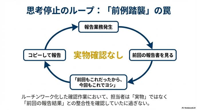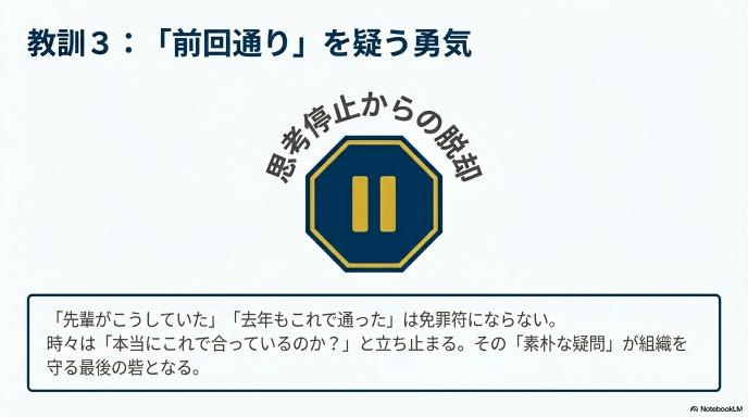 その思考停止が、ミスを長生きさせます。時々は「本当にこれで合っているのか?」と立ち止まる勇気が、組織を守ることにつながります。