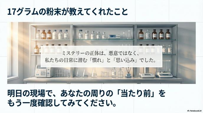 17グラムの粉末が消えたミステリー。それは、私たちの日常業務に潜む「慣れ」や「思い込み」という落とし穴を、改めて教えてくれているのかもしれません。