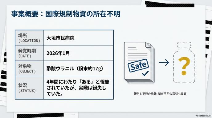 大垣市民病院で発生した「国際規制物資(酢酸ウラニル)」の所在不明事案。