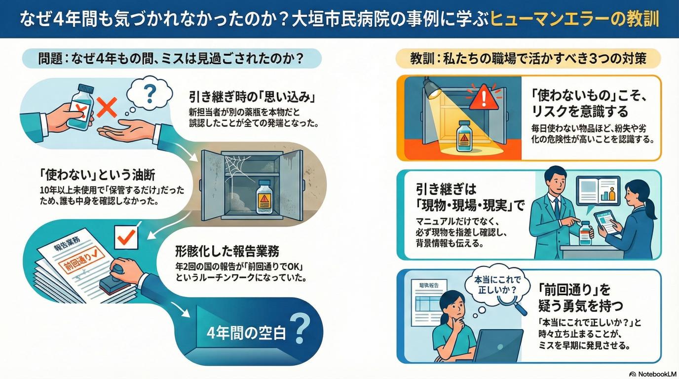 大垣市民病院は速やかに警察や規制委員会へ報告し、再発防止策として「複数人でのチェック体制」や「引き継ぎ時の現物照合の義務化」を掲げました。