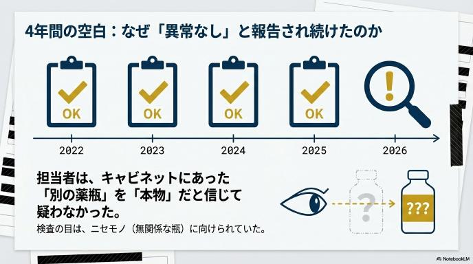 今回の事件で最も衝撃的だったのは、「4年間にわたり、別の薬瓶を『本物』だと思い込んで国に報告し続けていた」という点です。