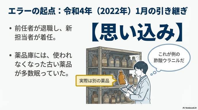 新担当者は、キャビネットにあった「別の薬瓶」を見て、「ああ、これが例の酢酸ウラニルだな」と誤認してしまいました。