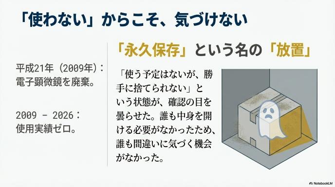 そんな「永久保存(という名の放置)」状態だったことが、確認の目を曇らせました。誰も中身を開けて確認する必要がなかったため、誰も間違いに気づかなかったのです。