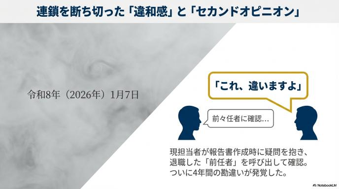 現担当者が報告書を作る際、ふと疑問に思って「前々任者(前の前の担当者)」に相談したのです。すると、「あれ? 話が噛み合わないぞ?」という疑惑が浮上。