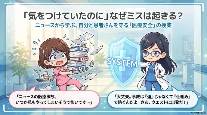 はじめに:医療事故は「不運」ではなく「仕組み」の問題 医療の現場を目指す皆さん、そして現場で奮闘する皆さん、こんにちは。 ニュースで「医療事故」や「投薬ミス」の報道を見るたびに、「自分もいつかやってしまうのではないか」と怖くなることはあり...